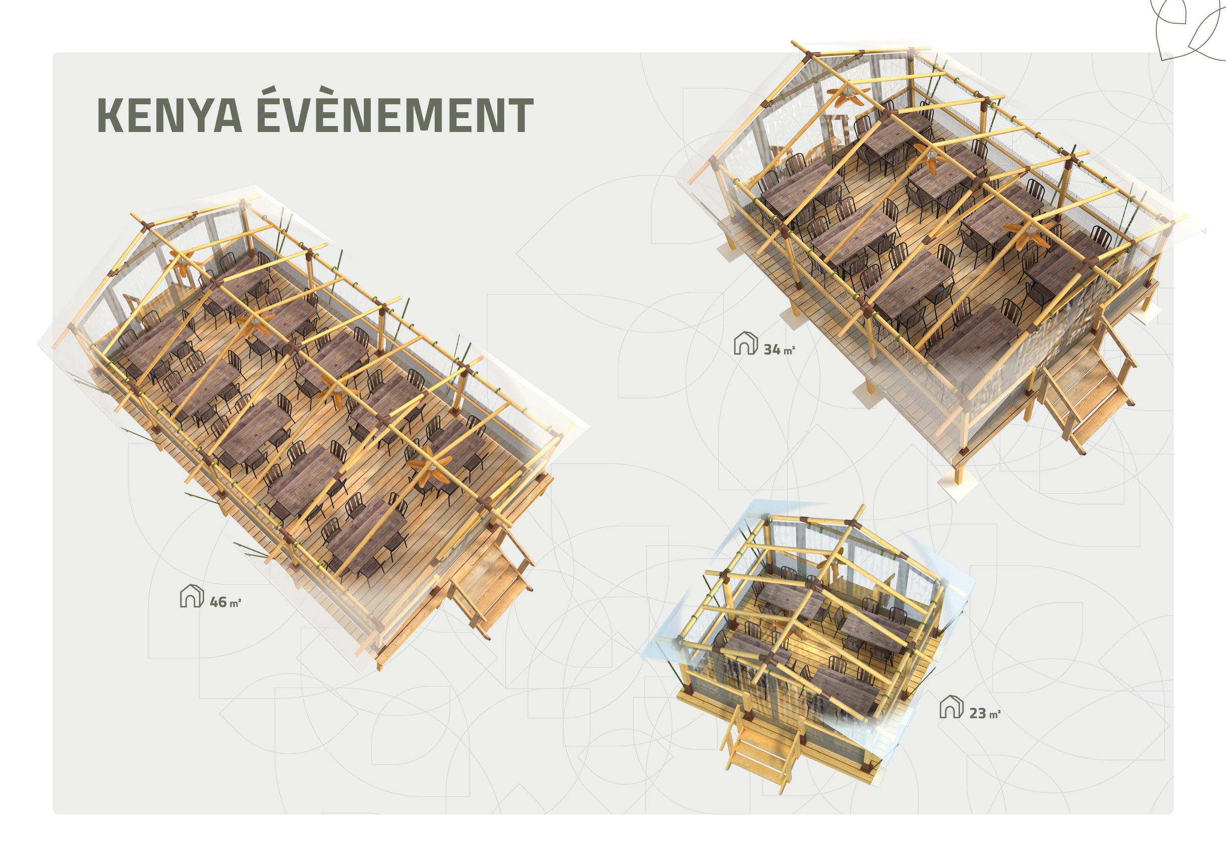 El KENYA ÉVÉNEMENT, en su versión lodge, le permitirá disponer de un espacio ideal y glamping para juegos o veladas, o configurar una zona de catering que hará las delicias de sus invitados.