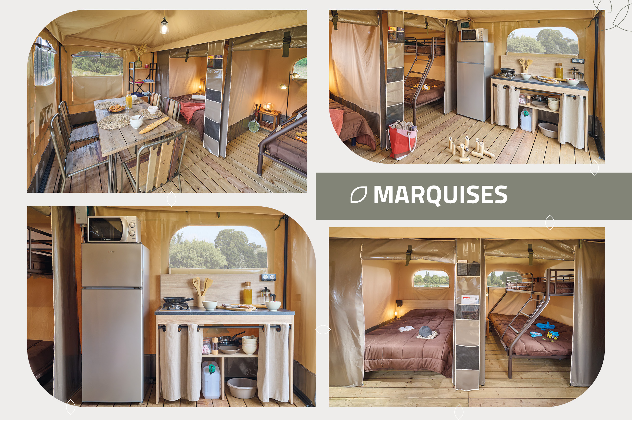 Pouvant héberger jusqu’à 6 personnes dans 2 chambres spacieuses, la MARQUISES est le bungalow idéal pour découvrir l’expérience des vacances en hébergement toilé en y associant plus de confort.